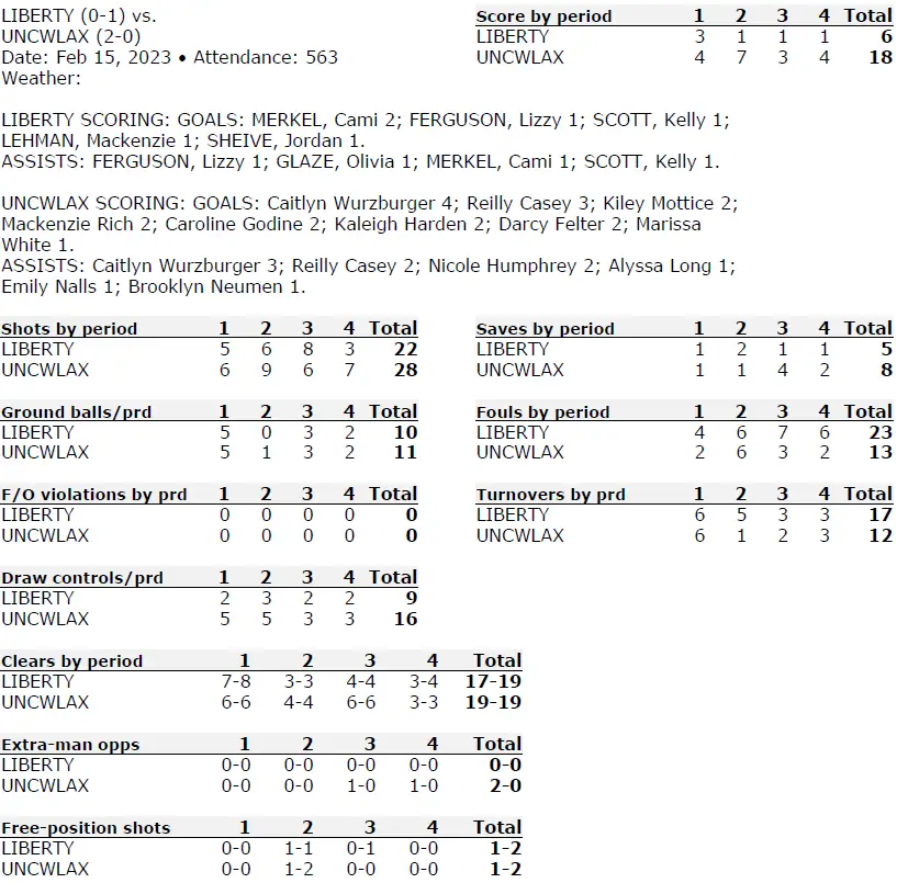 UNC fell behind by two goals twice early (2–0 and 3–1) after Liberty scored on two of its first three shots, with goals from Jordan Sheive and Lizzy Ferguson in the first 5½ minutes. It was all Carolina after the teams traded goals (from freshman UNC attacker Kiley Mottice and Liberty’s Cami Merkel), with a 13–1 run that extended into the third quarter.