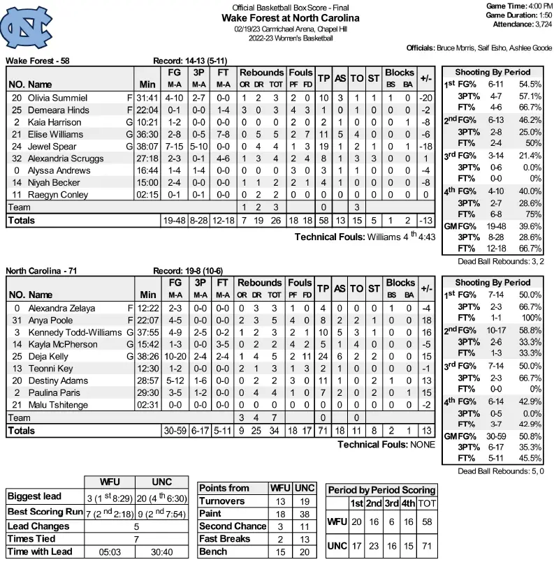 Kelly led Wake Forest by herself 8–6 in the first 3:09, scoring Carolina’s first eight points, including a four-point play. The Deacons finished the opening quarter with a 10–5 run to lead 20–17.