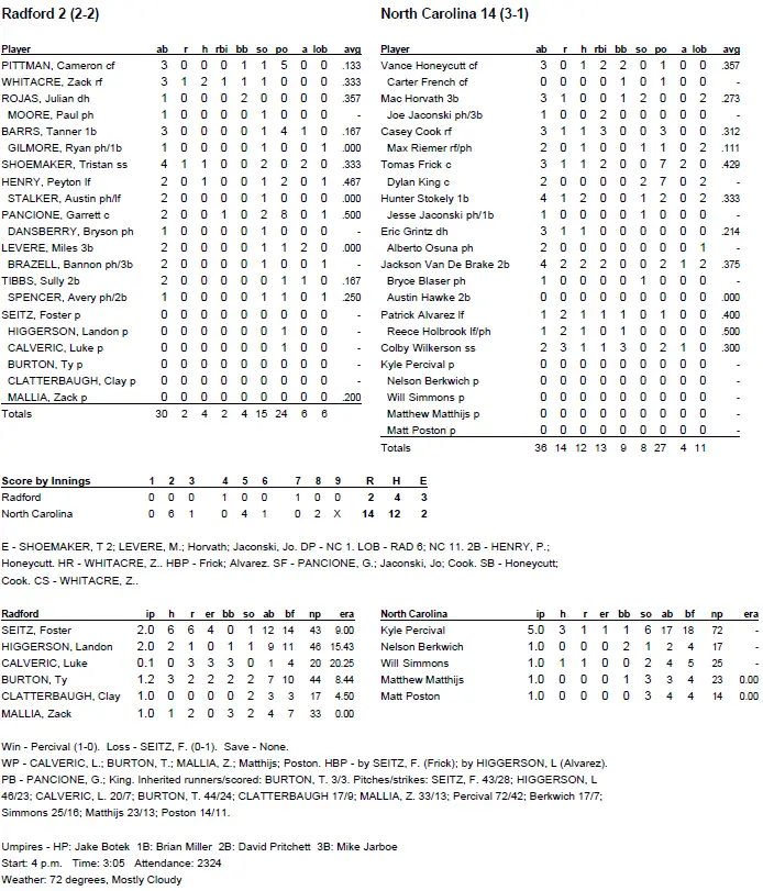 The third pitcher for Radford (2–2), Luke Calveric, left after walking the bases loaded in the sixth inning, with 13 balls on 20 pitches. His relief, Ty Burton, promptly gave up a two-run single to Cook and an RBI single to center field to Frick.