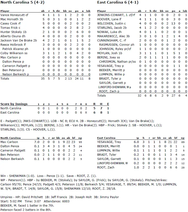 No. 11 East Carolina (4–1) broke loose for six eighth-inning runs after seven shutout innings from UNC starter Max Carlson and held on for a 6–5 victory Friday over the No. 12 Tar Heels in front of a Clark-LeClair Stadium-record 6,003 fans in Greenville.