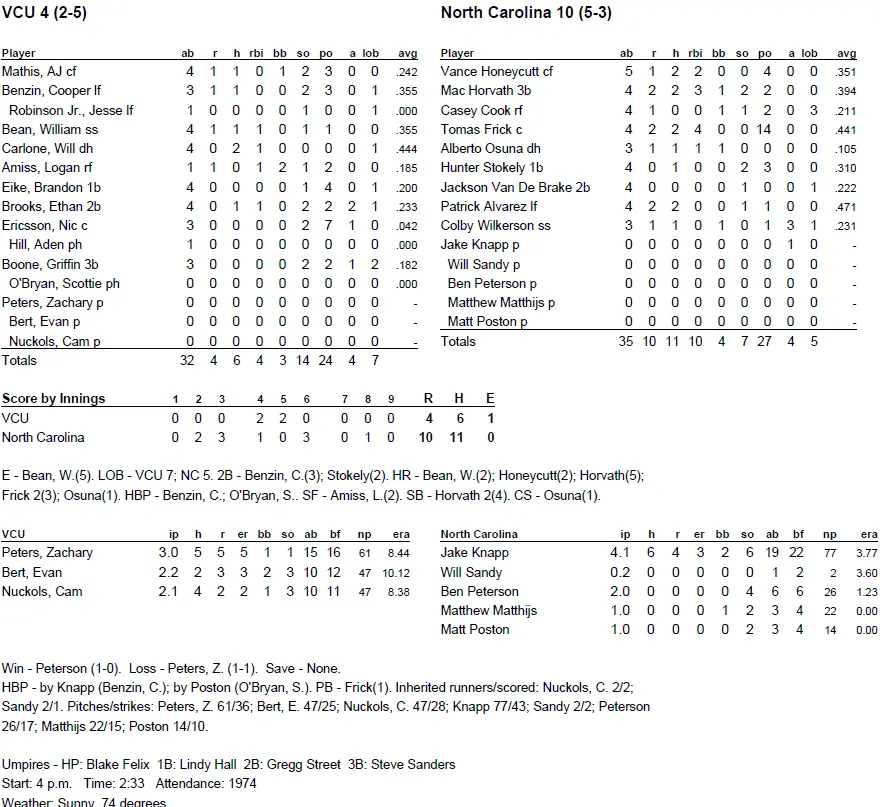 NOTES — The two-game series concludes at 4 p.m. Wednesday (ESPN3), with freshman left-hander Kyle Percival (1–0, 1.80 ERA) starting for Carolina. VCU hasn’t named a starter. … VCU is under the direction of first-year head coach Bradley LeCroy after Notre Dame hired the longtime Rams coach Shawn Stiffler as its head coach. … UNC won for the third time in the last four meetings with VCU. The Tar Heels won two of three from the Rams in last season’s NCAA Chapel Hill Regional, and lead the all-time series 24–8, including a 22–6 mark in Chapel Hill. … UNC has double-digit runs in half of its first eight games. … Junior Johnny Castagnozzi (blood clot) is expected to be cleared Thursday and play in this weekend’s three-game series with Stony Brook.
