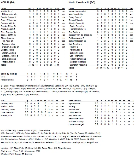 Mathis led off the fourth with a solo homer, but UNC quickly got that run back in the bottom of the inning when Horvath doubled to left field and later scored on an error.
