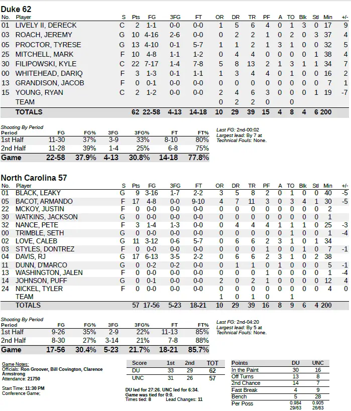 Duke responded with a 13–4 run to take a four-point lead on a pair of Kyle Filipowski free throws with 11:23 left in the first half, and UNC didn’t lead again until midway through the second half.