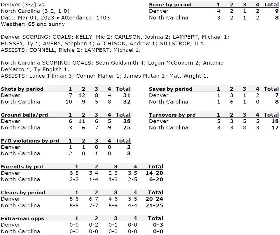 The numbers were pretty even, with UNC outshooting Denver 32–31 and forcing more turnovers (18–17), but the Pioneers had the advantage on groundballs (28–25) and shots on goal (17–15).