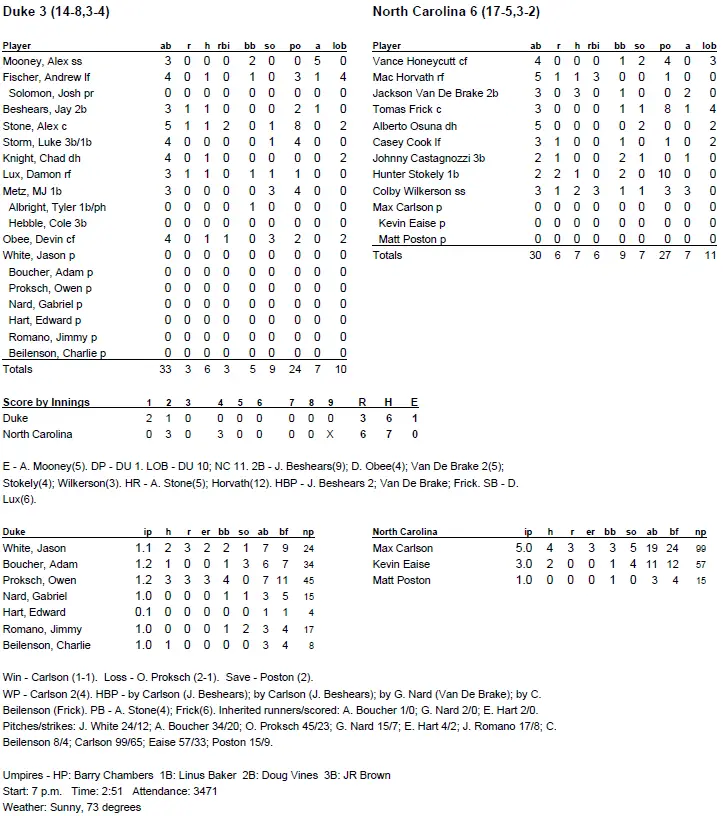 Fifth-year right-hander Kevin Eaise pitched three scoreless relief innings and junior right-hander Matt Poston held the Blue Devils (14–8, 3–4 ACC) hitless in the ninth for his second save in three days to secure the win for UNC (17–5, 3–2).