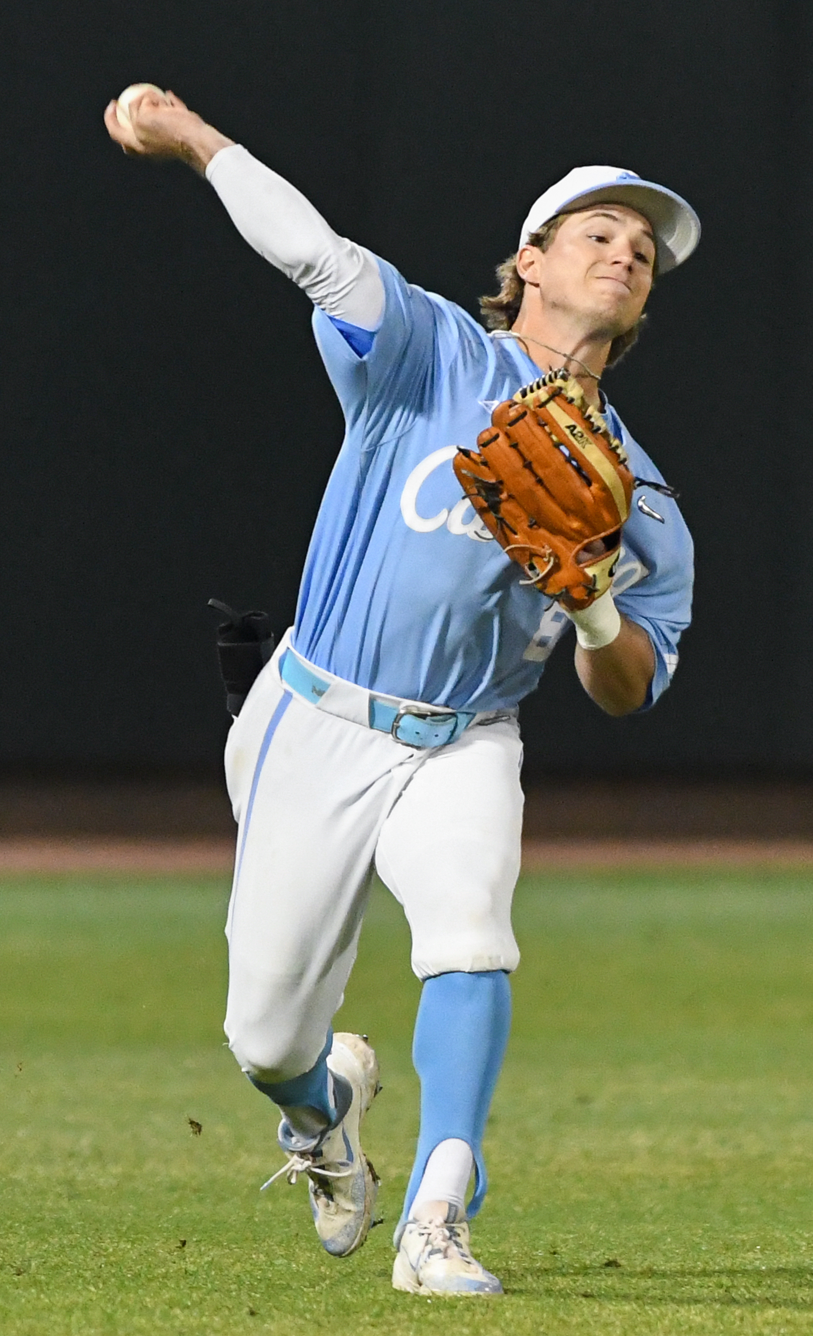 Carolina sent 11 batters to the plate in the first inning. Six got hits, and seven scored to quickly build a big lead, with junior catcher Tomas Frick and junior first baseman Hunter Stokely belting back-to-back two-run doubles.
