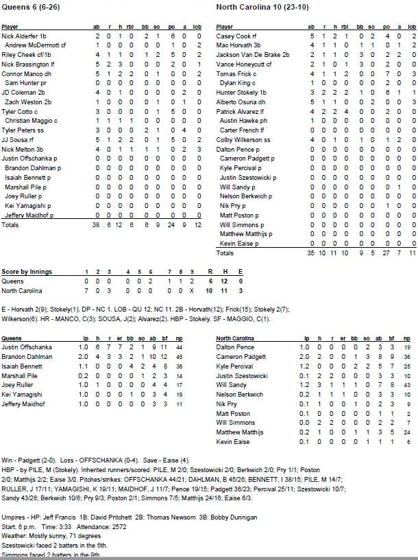 Queens, in its first year of a four-year transition to Division I and No. 260 in the RPI, fell to 6–25 with its fourth consecutive defeat. The Royals got a two-run homer from Connor Manco in the sixth inning after Horvath dropped a foul pop-up and a solo shot from JJ Sousa in the seventh.