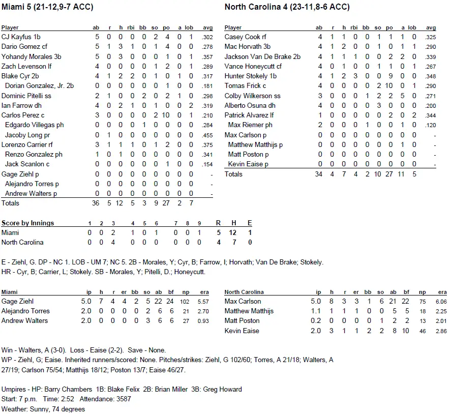 The Tar Heels (23–11, 8–6 ACC) had a rough time in the final two innings against Walters’ fastballs, which consistently came in around 95 mph. The Canes scratched out a ninth-inning run on a safety-squeeze bunt, and that was enough to give Miami (21–12, 9–7) its first road ACC win of the season.