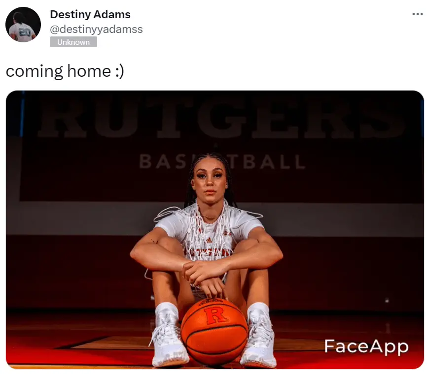 “Coming home,” Adams, from Manchester, N.J., posted on social media with a smile emoji in announcing her decision Saturday evening.