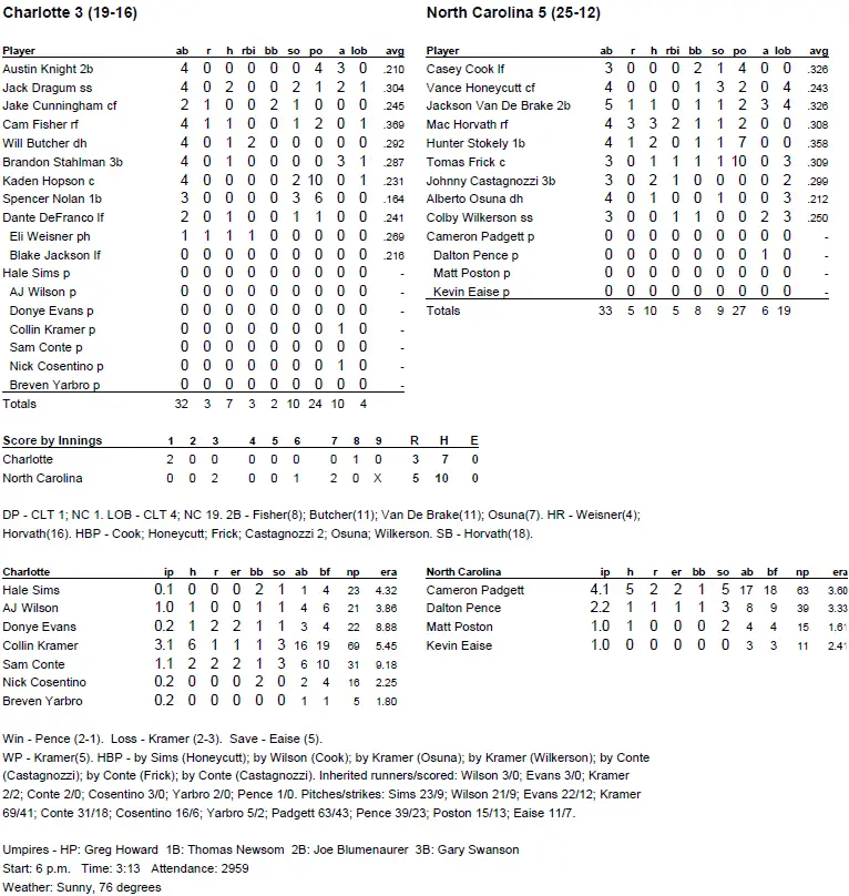 Control issues by Charlotte’s seven pitchers and UNC’s 10 hits fueled numerous Carolina chances. Niners pitchers walked eight batters and hit seven others. The problem? Only two of those 15 baserunners scored.