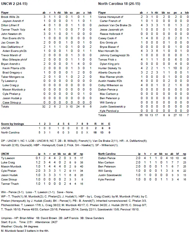 After UNCW (24–15) became the fifth consecutive UNC opponent to score in the first inning (Tanner Thach’s RBI single), the first four Tar Heels reached base in a five-run first inning and it quickly became a rout. Van De Brake’s RBI double jump-started the flurry, with Horvath blasting a 344-foot shot to left for a three-run homer and Alberto Osuna launching a 407-foot drive to center for a solo home run.