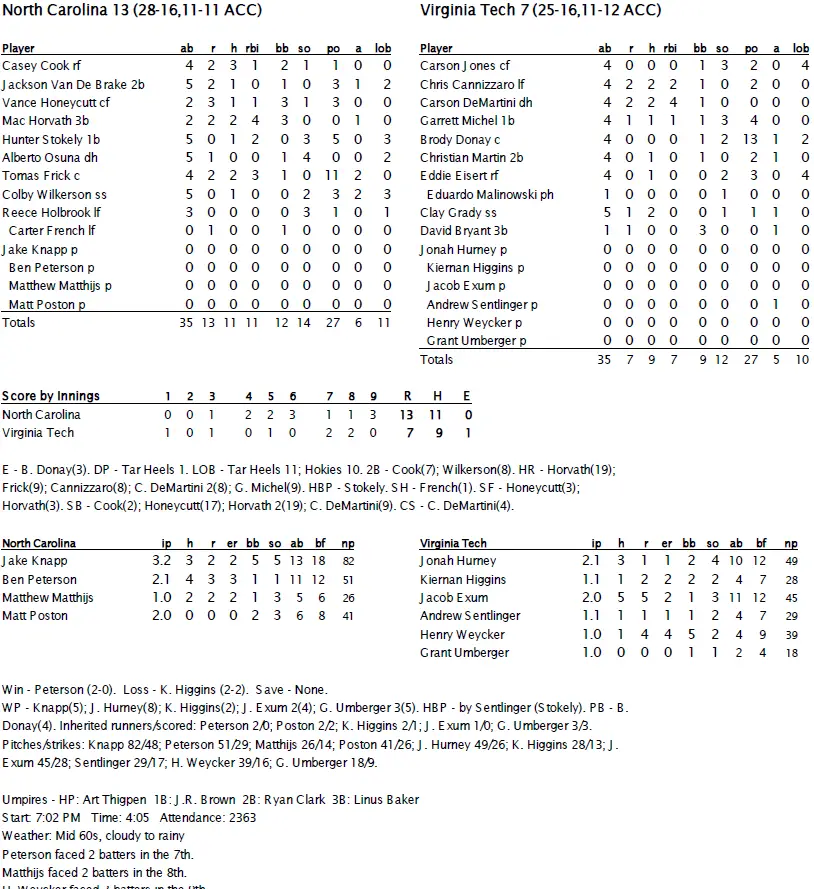 UNC’s series win ended a streak of four ACC series without losing for Virginia Tech (25–16, 11–12), which split a two-game set with Duke during that stretch.