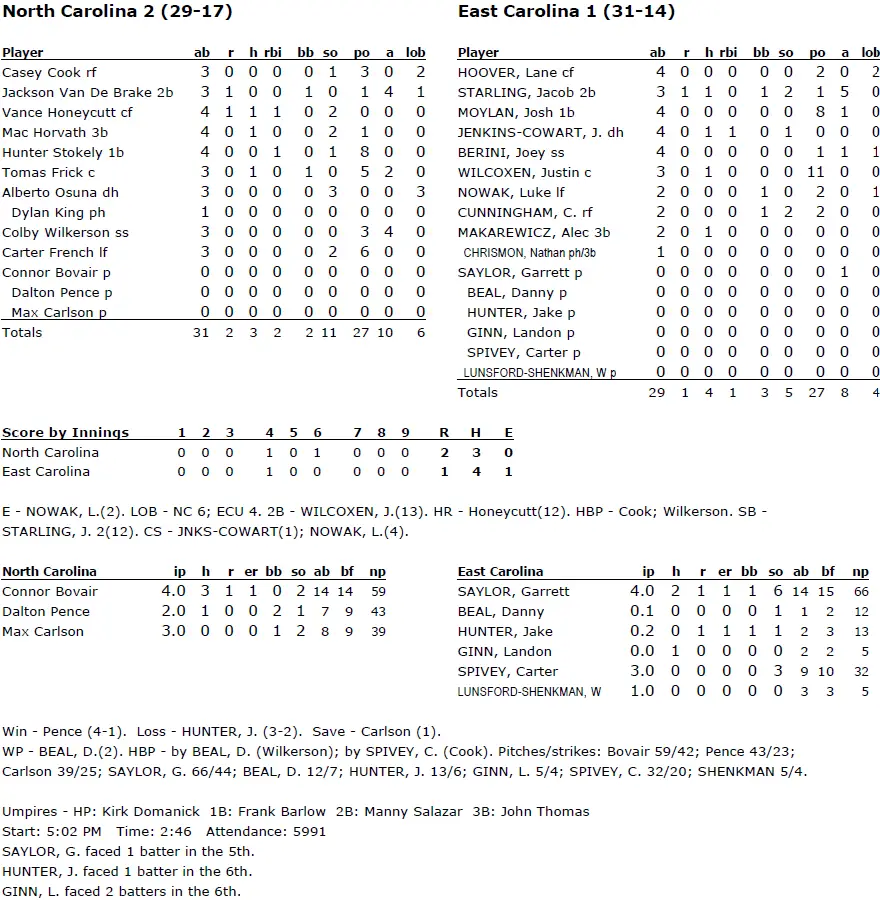 Paced by sophomore center fielder Vance Honeycutt’s solo home run in the fourth inning, Carolina (29–17) earned its fourth win over a current Top 25 team in 17 tries, with two of the previous losses both coming by 6–5 scores against ECU (31–14) in February.