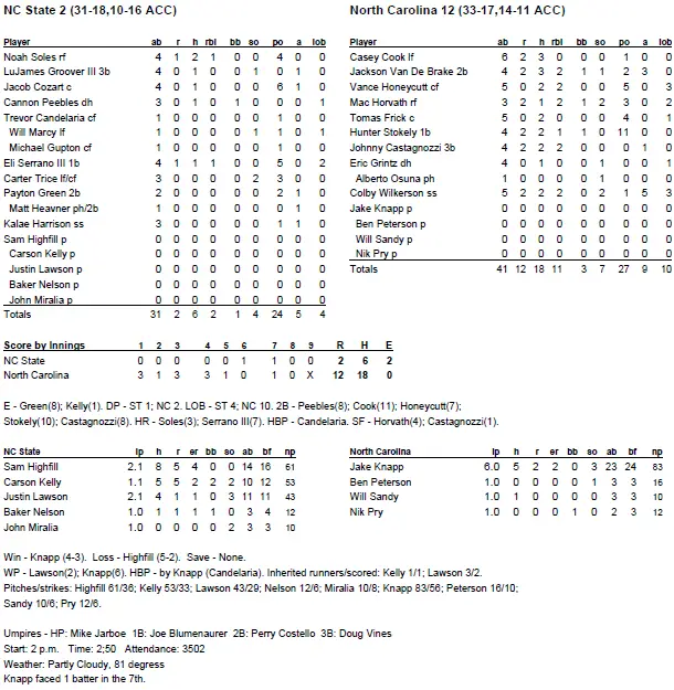 Carolina (33–17, 14–11 ACC) backed the 6–5 Knapp with relentless offense as the Tar Heels rolled to a 12–2 senior day victory Saturday over N.C. State at Boshamer Stadium. It completed a weekend sweep of the Wolfpack for UNC’s fifth consecutive victory and seventh win in the last eight games. It was UNC’s first sweep of an ACC series this season.