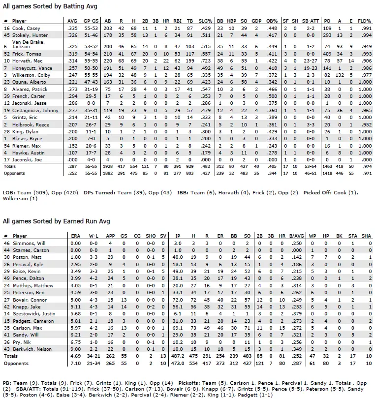 Junior catcher Kyle Teel, the ACC Player of the Year, is one of four Cavaliers to make All-ACC first team. He led the league in batting average (.393) and total hits (91). His 23 doubles tie for both the ACC lead and the Virginia single-season record. In addition, Teel has 13 homers with 62 RBI (seventh among ACC players), and his .480 on-base percentage is fifth in the league.