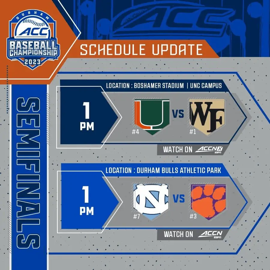 To increase the chances of both semifinals being played, they are both now scheduled to start at 1 p.m. UNC’s game against No. 6-ranked and No. 3-seed Clemson (41–17) will be played at Durham Bulls Athletic Park and air on ACC Network. No. 1-seed Wake Forest (47–9) will play Miami at Boshamer Stadium in Chapel Hill in a game that will stream on ESPN3. The No. 4-seed Miami (39–18) beat Duke 7–6 Friday afternoon. The Deacons beat No. 8-seed Notre Dame 7–5 Friday night.