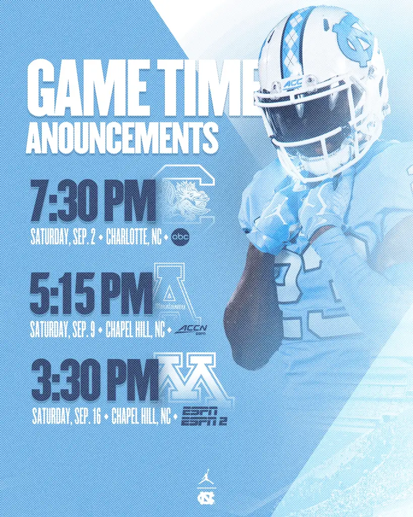 The ACC announced game times for Carolina’s first three football games, starting with the Sept. 2 opener in Charlotte against South Carolina, which will start at 7:30 and air on ABC.