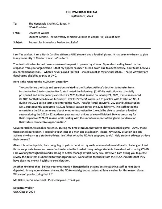 “You can’t say you’re about helping kids and then show a total disregard for the kids you’re supposed to be helping. It’s clear they are about process and not people. Fortunately, the committee still has a chance to recommend a correction to this egregious error. We look forward to them hearing his case, and recommending the only outcome this case deserves, that Tez Walker should be eligible to play.”