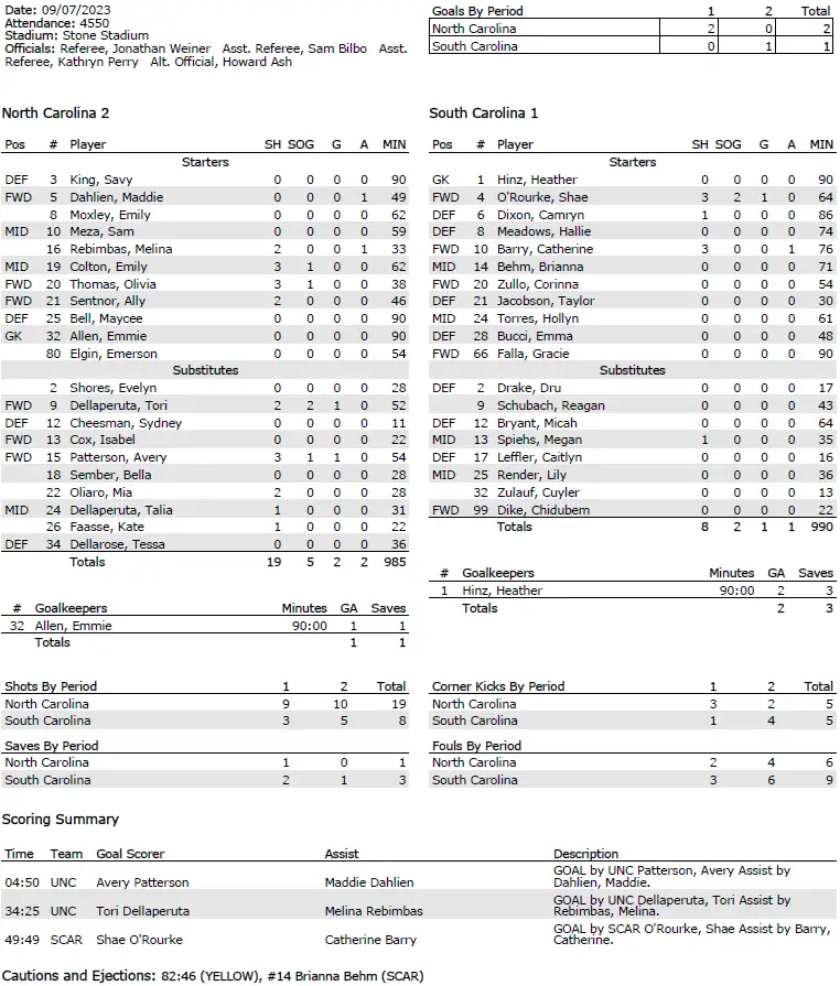 It was another physical battle as South Carolina had nine fouls and two yellow cards, with UNC committing six fouls. UNC won shots 19–8 and shots on goal 5–2 but South Carolina got off the most shots by a Tar Heels opponent this season (five was the previous high by Penn State and Arkansas.)