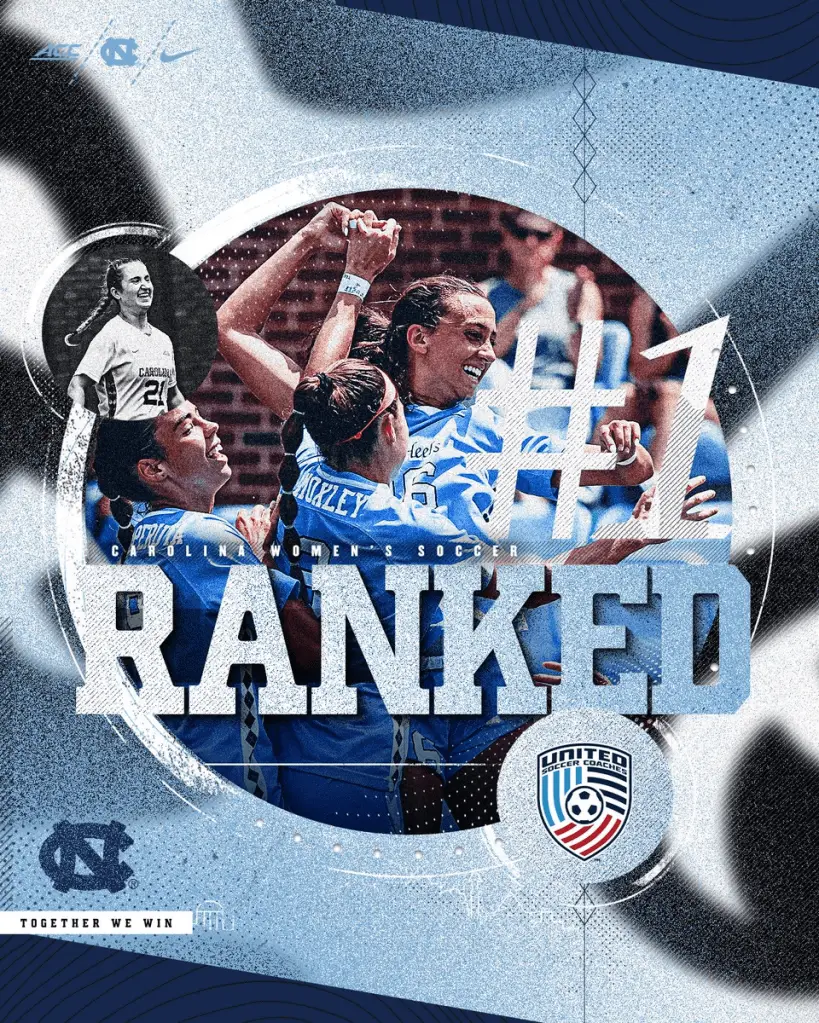 It’s the Tar Heels’ first time at No. 1 since they were the top-ranked team for the second (Aug. 23) and third (Aug. 30) polls last season before falling to No. 2 after losing to eventual national champion UCLA. UNC was No. 1 for the first eight weeks of the 2020–21 season.
