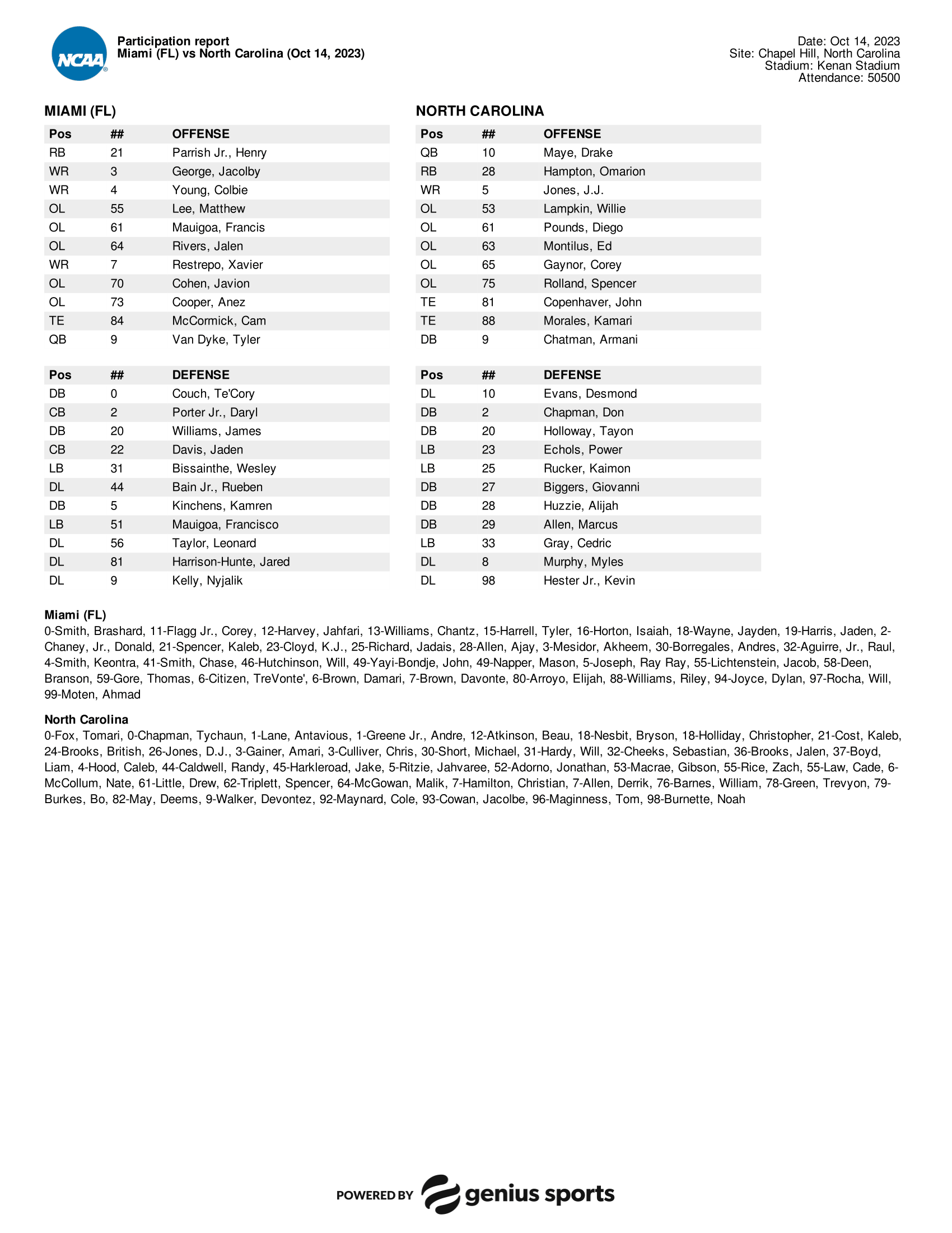 NOTES — Carolina plays its third consecutive home game at 6:30 Saturday night (The CW) against Virginia (1–5, 0–2), which had this weekend off after beating William & Mary at home 27–23 on Oct. 7. … Punter Ben Kiernan, who took a big hit last week against Syracuse, is out for the season with a knee injury and was seen pregame getting around on crutches. His replacement, Tom Maginness, did well in his college debut until a late 27-yard kick, averaging 38.3 yards per punt, including a 50-yard second-quarter kick. … Wide receiver Kobe Paysour is out indefinitely with a foot injury suffered in practice on Tuesday. … Walker is the 16th Tar Heel to have three or more touchdown receptions in a game and the first to accomplish that against Miami. … UNC became the first opponent to top 100 yards this season against Miami (which entered the game as the nation’s top defense against the rush). … Carolina surpassed its previous penalty-yards high for a game of 60 yards against App State by halftime when it had 97 and finished with 147. … Carolina improved to 56-22 as a ranked team in 15 seasons under Brown. … Walker was the first UNC player with three touchdown receptions in a game since Josh Downs did it last season at Wake Forest. … Carolina extended its win streak over the Hurricanes to five. … UNC has won 16 of 27 meetings with Miami, although two wins were vacated.