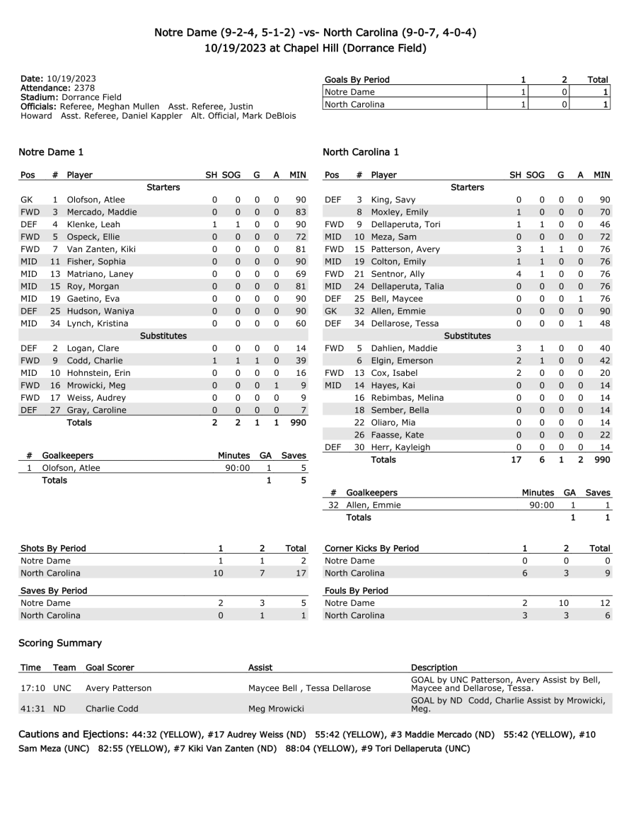 NOTES — Carolina faces Syracuse (2–12–2, 0–7–1) at 1 p.m. Sunday (ESPN3) in its final regular-season home game. The Orange last won a game with a 2–1 win over Binghamton on Aug. 27 and is on a 12-game winless streak after Thursday’s 2–0 loss at N.C. State. … UNC freshman midfielder Evelyn Shores, who earned four team player-of-the-match awards and started six games, is out for the season after tearing her right ACL in Friday’s 1–1 draw at Wake Forest. … Redshirt sophomore Emerson Elgin came off the bench because she was on a 30-minute playing time restriction as she recovers from a knee issue. That allowed sisters Tori and Talia Dellaperuta to start together for the first time this season. They were in the middle of the 4–3–3 alignment with Talia at midfield and Tori at forward. … Bell (No. 5), Sentnor (No. 25), Meza (No. 28) and Patterson (No. 40) made TopDrawerSoccer’s Midseason Top 100 Players list. Savy King (No. 2), Shores (No. 31), Olivia Thomas (No. 50) and Melina Rebimbas (No. 55) made its Top 100 Freshmen list. … A well-done “Athletes are Artists/Artists are Athletes” video featuring Meza and tap dancer Michelle Dorrance, daughter of the coach, was played on the video board at halftime. … UNC leads the all-time series with the Irish 23–7–4, including 7–5–2 at home. … Carolina’s defense has held 15 of its 16 opponents to 10 shots or fewer, seven of those to five or fewer and three to only one.