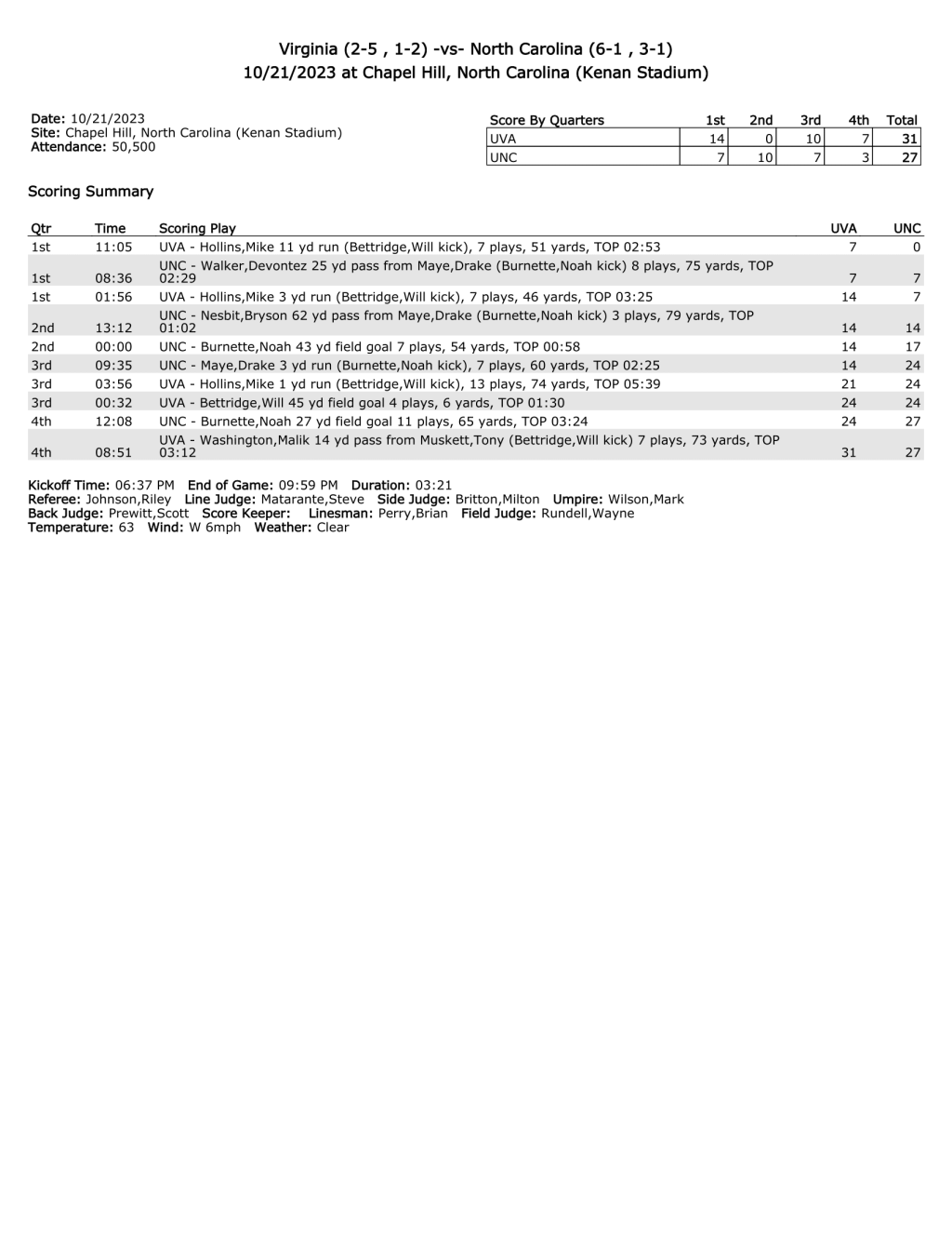 Virginia tied it with a 74-yard drive for Hollins’ third scoring run, this one from a yard out, and a 45-yard Will Bettridge field goal after a 16-yard punt from UNC’s Tom Maginness.