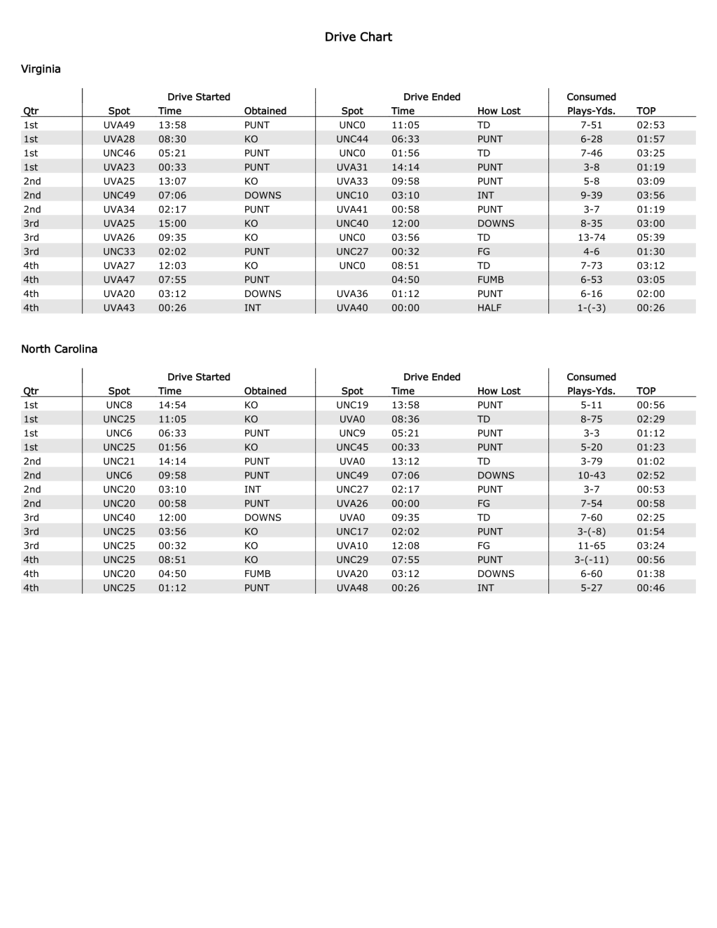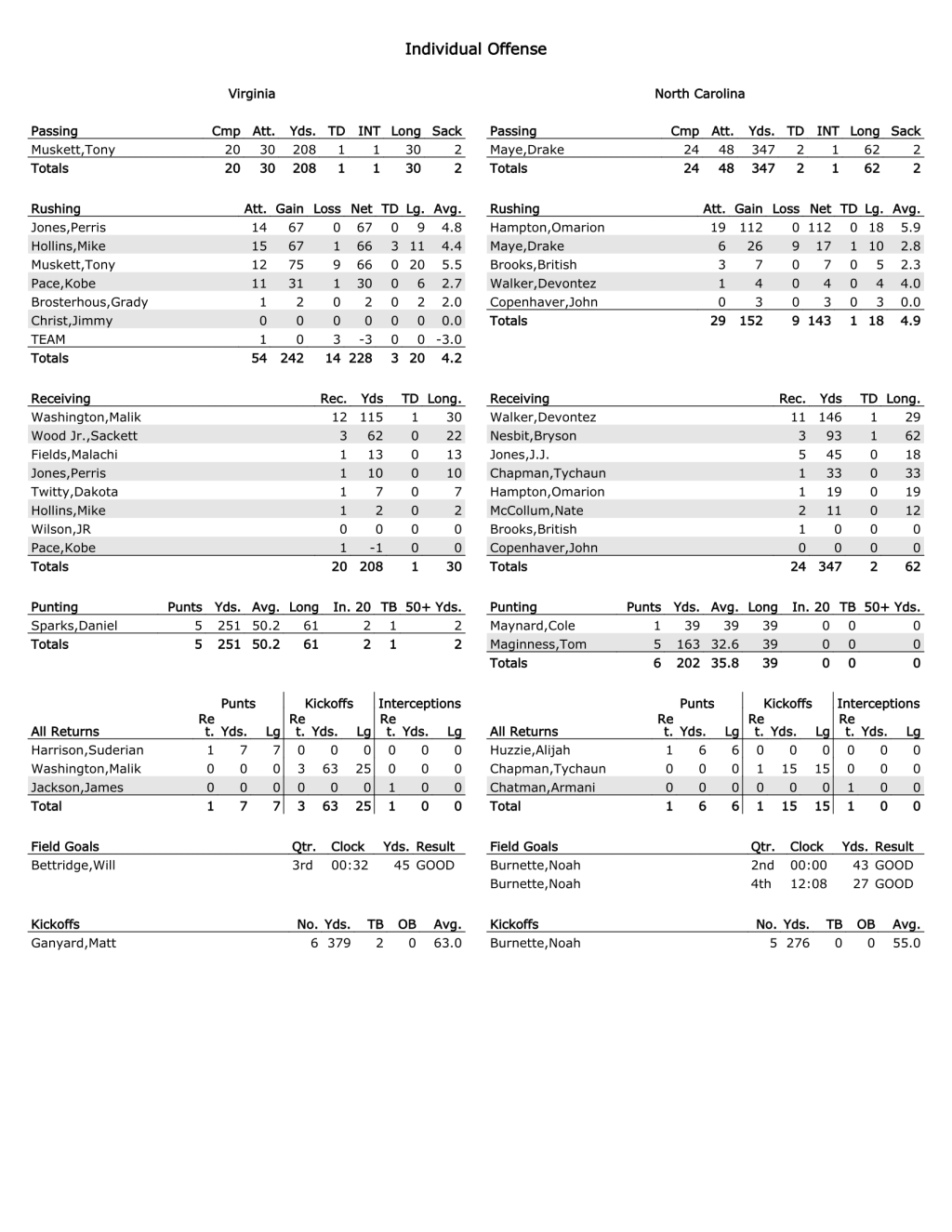After UNC stopped Virginia on a fourth-and-2 at the UNC 41 on the initial second-half drive, the Tar Heels drove 60 yards for a 3-yard Maye touchdown run, his fifth of the season and 12th of his career.