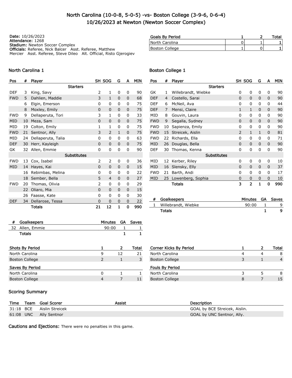 Shortly after seven UNC substitutes came into the game, Boston College took advantage of a Tar Heels turnover, and Aislin Streicek’s goal in the 32nd minute gave the Eagles a 1–0 lead. Carolina goaltender Emmie Allen ran into a BC player and bobbled the ball.