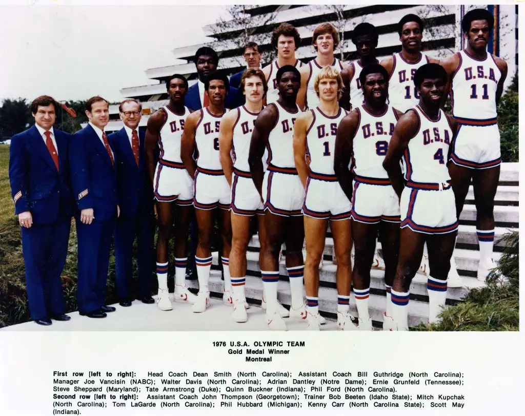 Above, Walter Davis, right, shares a moment with James Worthy and Michael Jordan. Below is a team picture from the 1974 United States gold-medal-winning Olympic team. Davis is on the first row and is the player on the far left, with Phil Ford on the far right. The player at the far left on the second row is Mitch Kupchak, with Tommy LaGuarde to his right. Head coach Dean Smith is on the far left, with assistant coach Bill Guthridge to his right.