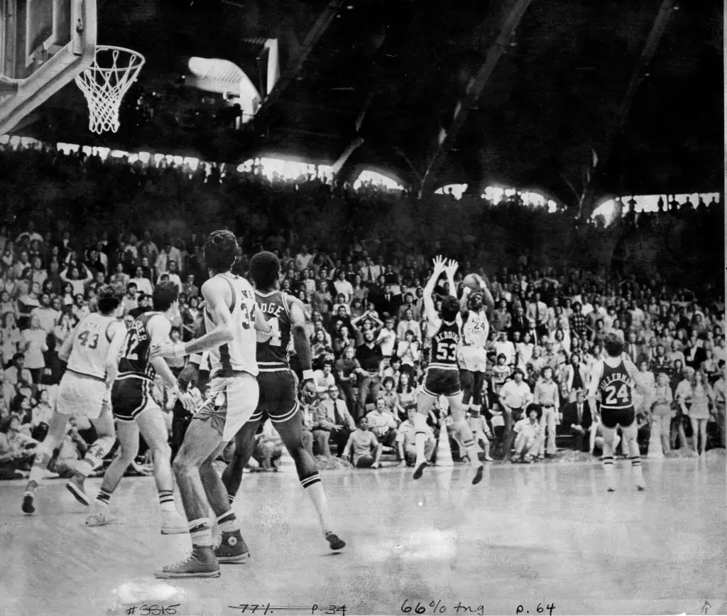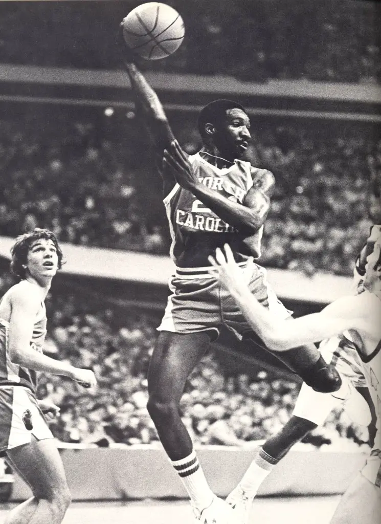 Walter Davis puts up the buzzer-beating, 25-foot bank shot to tie Duke at the regulation buzzer in 1974 at Carmichael Auditorium. The Tar Heels won in overtime.