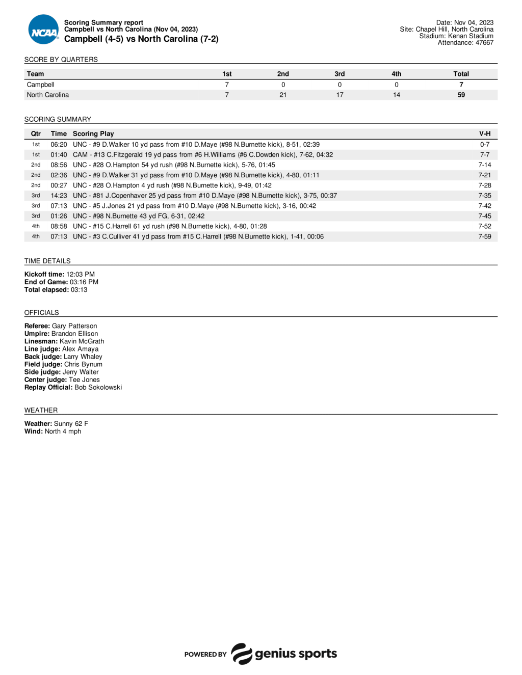 Maye connected with Walker again, this time for a 31-yard scoring play, as UNC scored twice in just over two minutes late in the first half. Hampton’s second touchdown, a 4-yard run with 27 seconds left, gave the Tar Heels a 28–7 halftime lead.