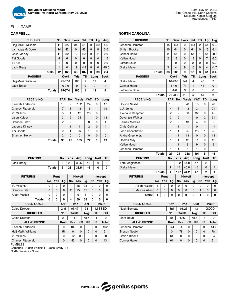 Maye connected with Doc Chapman for 45 and 5 yards after UNC took the second-half kickoff before completing a 25-yard touchdown pass to tight end John Copenhaver. After Campbell fumbled on an apparent fake punt attempt, Maye found wide receiver J.J. Jones wide open in the left side of the end zone for a 21-yard scoring play.