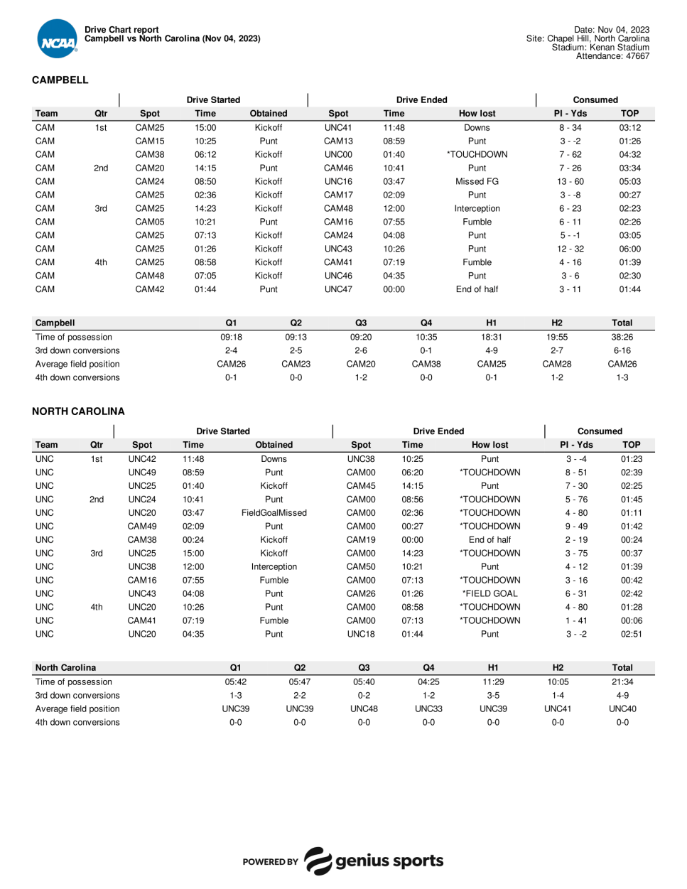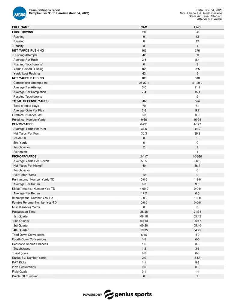 After Campbell (4–5) tied it at 7 in the first quarter, though, the Camels didn’t score again and had a tougher time generating offense in the second half until the Tar Heels cleared their bench in the fourth quarter. Even then, the Camels couldn’t do much.