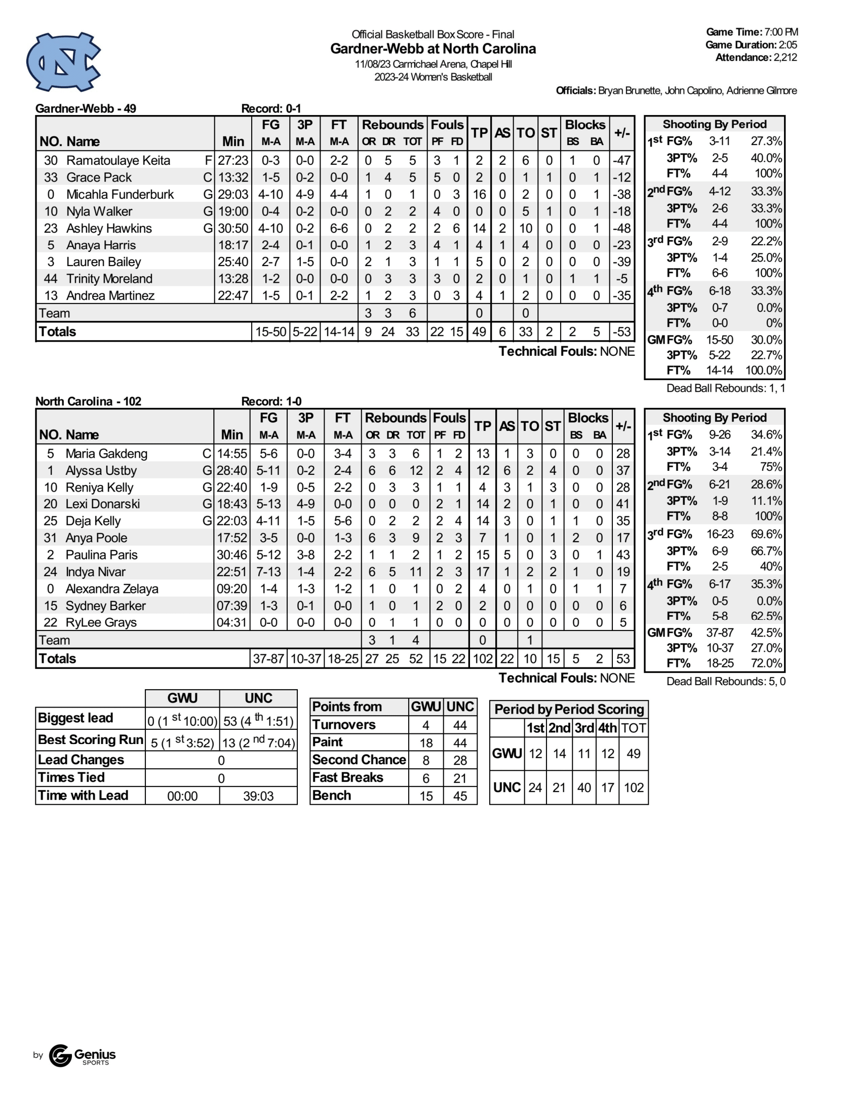 Gardner-Webb guard Ashley Hawkins had an unfortunate double-double with 14 points and 10 turnovers and was -48. That’s equal to UNC’s turnover total as a team. Micahla Funderburk led the Bulldogs, tying her career-high with 16 points.