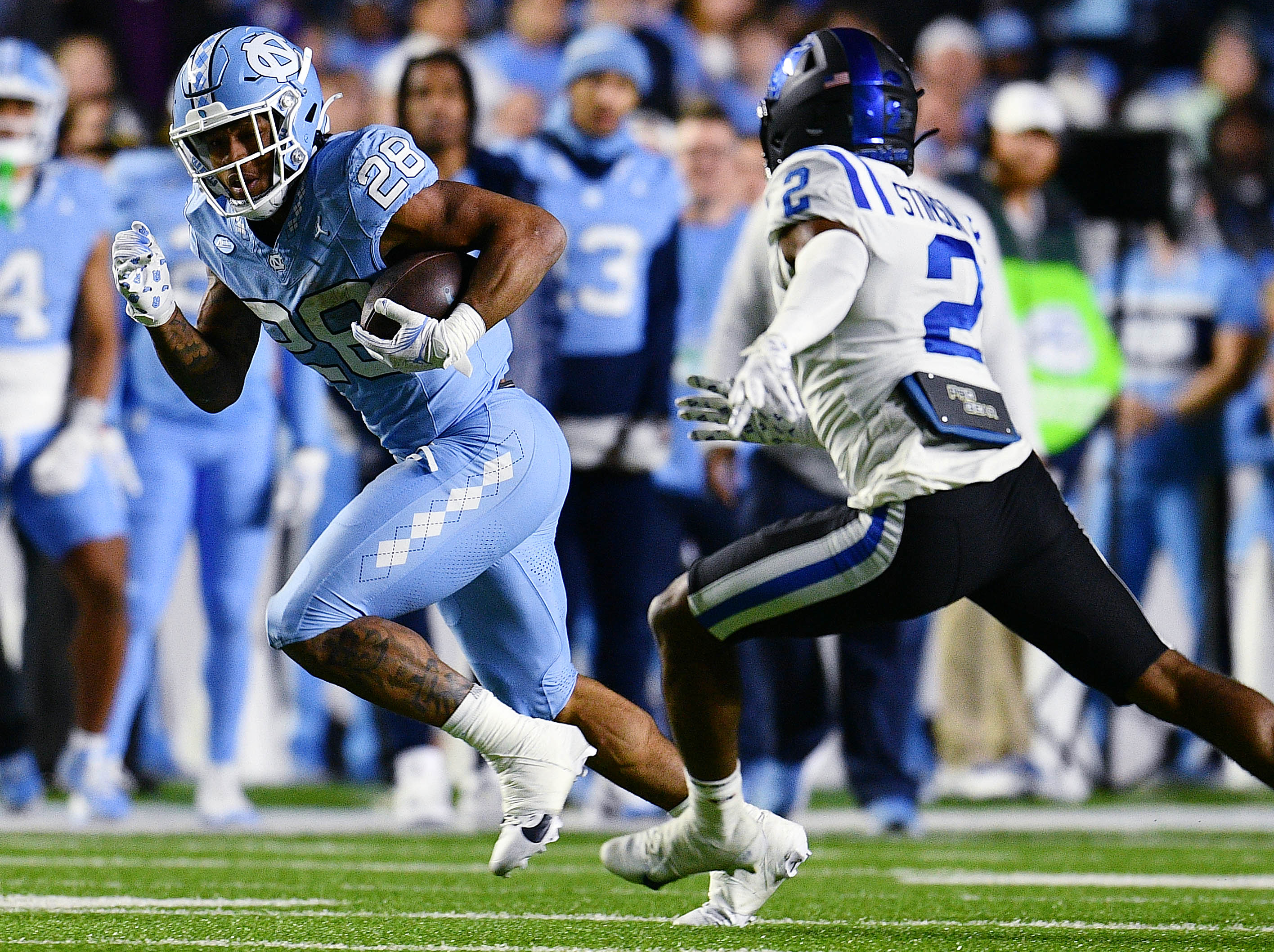 The 110th meeting between Duke and North Carolina was certainly one that has likely never been seen before in the history of the rivalry. UNC dominated the game early but was nursing a small lead on the scoreboard until the first play of the fourth quarter, when the Tar Heels went up 12 at 26–14 on an Omarion Hampton touchdown run. Then the game went to plaid.