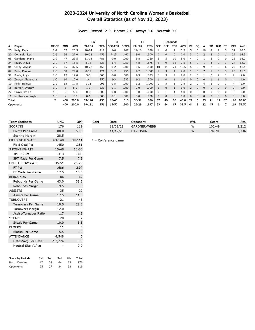NOTES — On Wednesday, Ustby and Deja Kelly were named to the watch lists for the Wooden Award and the Naismith Trophy. … Hampton has pulled off two basketball upsets in Chapel Hill, both in openers of losing Carolina seasons. The Pirates’ men’s team won 77–69 at the Smith Center on Nov. 16, 2001, to start UNC’s infamous 8–20 season. The Hampton women’s team won 70–66 on Nov. 10, 2017, in Carmichael Arena to start UNC’s 15–16 season, the Tar Heels’ last losing season. … In the only other women’s basketball meeting, Carolina won 93–50 on New Year’s Eve in 1998. … Junior Boston College transfer center Maria Gakdeng leads the ACC in field-goal percentage at 78.6%, well ahead of Clemson’s Amari Robinson (72.2%). … With Oklahoma and N.C. State debuting in the AP Top 25, Carolina now has 10 games on its schedule against teams currently ranked — No. 1 South Carolina, No. 8 UConn, No. 9 Virginia Tech (two games), No. 12 Florida State, No. 14 N.C. State (two games), No. 16 Notre Dame, No. 19 Louisville and No. 25 Oklahoma — and could possibly play an 11th in No. 2 Iowa on the third day of the Gulf Coast Shootout. …. In ACC rebounding statistics, Ustby is tied for fourth (10.5 per game) and Nivar is tied for 11th (6.5). … Senior guard Deja Kelly leads the team in scoring at 16.0 per game (15th in the league) and assists at 5.0 per game (tied for seventh in the ACC). … Nivar leads the team in free-throw percentage and is tied for 10th in the league at 87.5%. … Ustby leads the team in steals and is tied for fourth in the league at three per game. … Donarski leads the team in 3-pointers with seven (fourth in the league) and in 3-point shooting percentage at 46.7% (eighth in the league). Sophomore guard Paulina Paris has made 45.5% of her 3-pointers and has five 3s (both 10th in the league). … Carolina is second in the ACC in assist-to-turnover ratio at 1.67 (35 assists, 20 turnovers). Paris leads the team and is third in the ACC in that category at 7.0 (seven assists, 1 turnover), Deja Kelly is fifth in the league at 5.0 (10 assists, 2 turnovers) and Ustby is sixth at 4.5 (nine assists, 2 turnovers). … Carolina is tied for third in the league in offensive rebounds per game (18.5), turnover margin (+12) and assists per game (tied with 17.5). … UNC is tied for second in the ACC in scoring at 88 per game.