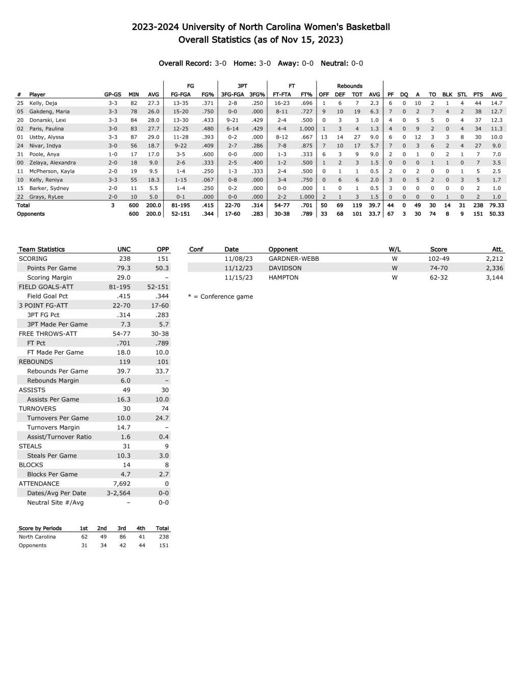 Carolina has played with only 10 available scholarship players through the first three games. Redshirt sophomore center Teonni Key (left foot injury) has missed all three games, and senior center Anya Poole (lower-body injury) has missed the last two.