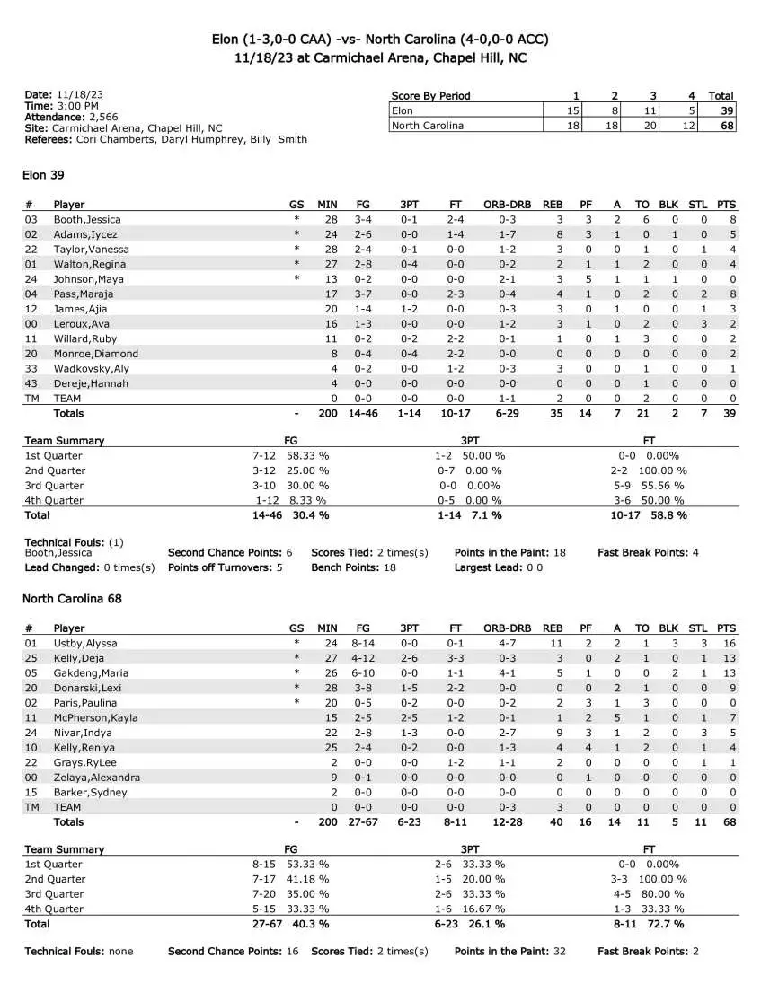 Deja Kelly also scored 13 points. Elon’s reserves outscored North Carolina’s backups by 18-17.