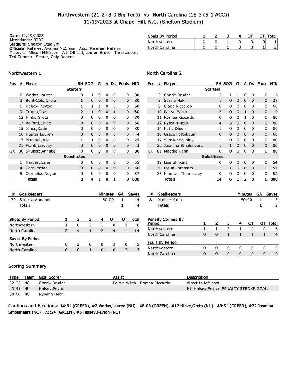 In UNC’s first season under 23-year-old head coach Erin Matson, sophomore forward Ryleigh Heck buried a stroke in the sixth round to propel UNC to win the shootout 3–2 and the game 2–1 over Northwestern, after 80 minutes and two overtimes, before a standing-room-only crowd of 3,200 at Karen Shelton Stadium.