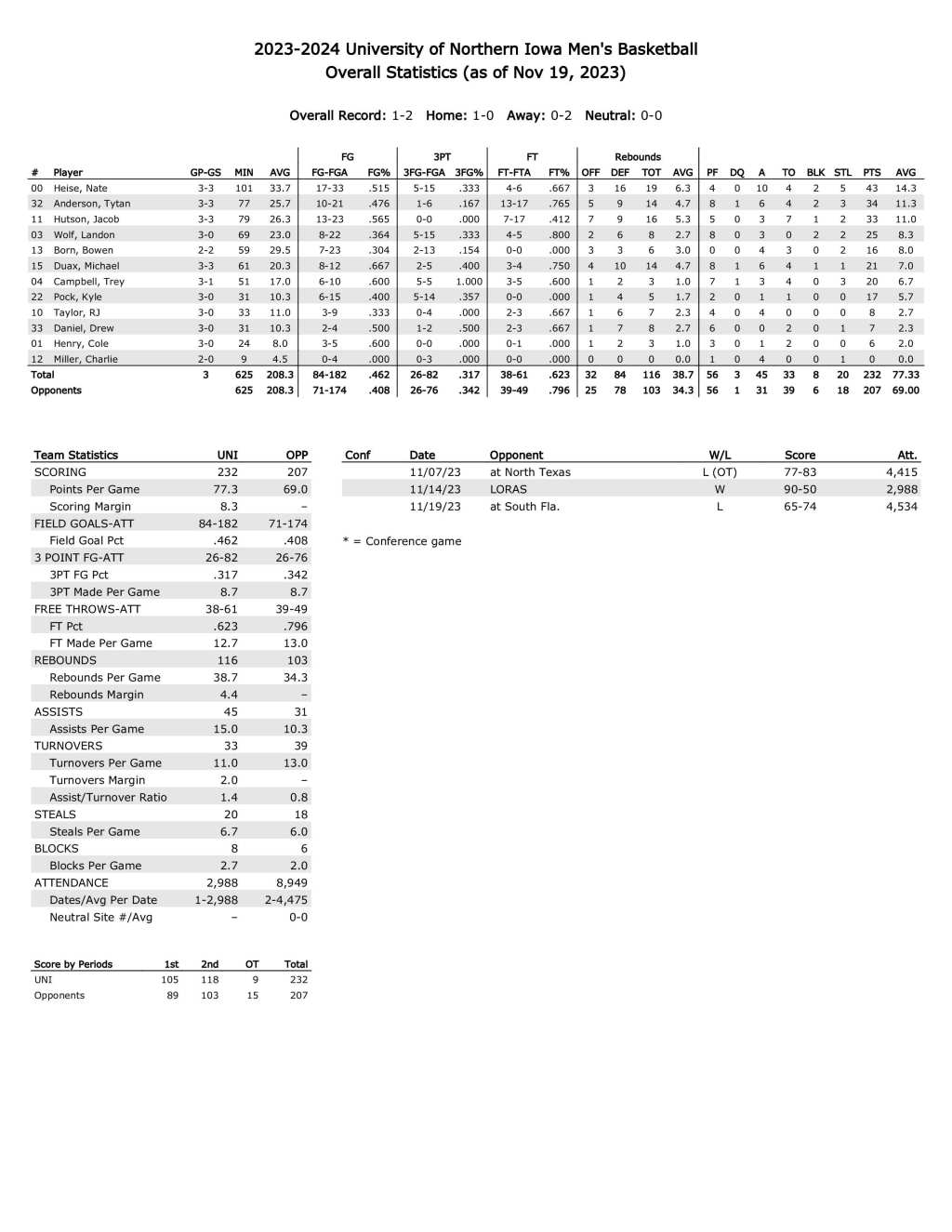 Northern Iowa beat Division III Loras 90–50 at home and has lost two road games: 83–77 on Nov. 7 in overtime against North Texas and 74–65 on Sunday against South Florida.