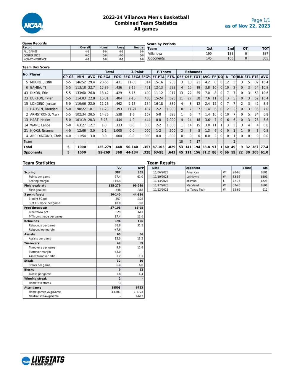 Villanova season statistics