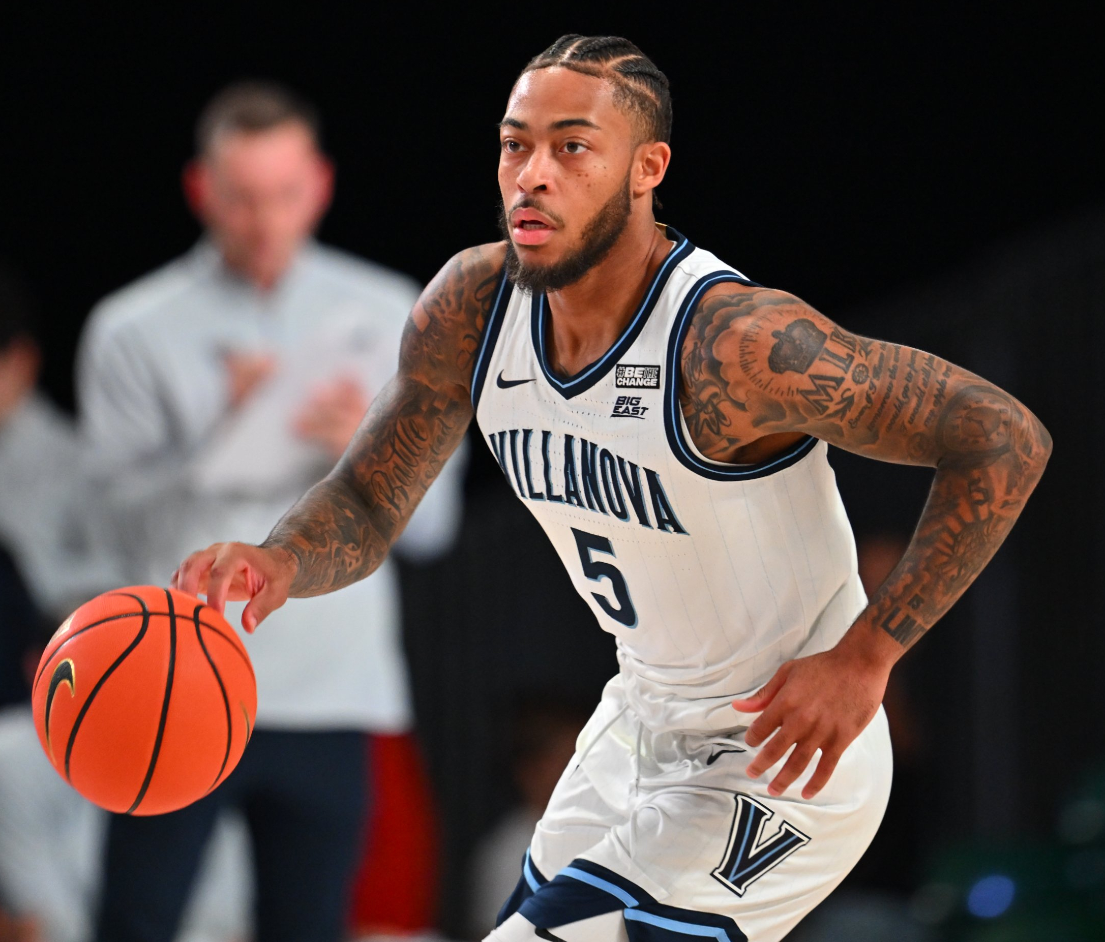 Redshirt senior 6–8, 255-pound center Eric Dixon, a second-team All-Big East selection last season who scored 19 points Wednesday, and fifth-year 6–5, 210-pound guard Justin Moore (top photo), who added 18 points, lead Villanova.