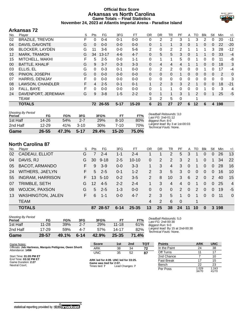Headlining the performance was guard RJ Davis, who poured in 30 points as the No. 14 Tar Heels defeated No. 20 Arkansas 87–72 with a strong second half on the final day of the three-day tournament in Nassau, Bahamas.