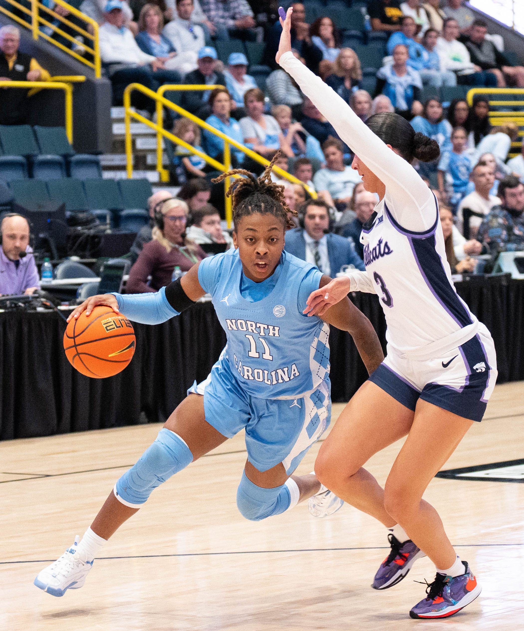 Carolina came out with energy and forced four early turnovers, allowing only one field goal early. But Kansas State (6–0) scored 12 straight points to go up 14–4 on an Imani Lester layup with 2:29 left in the first quarter. An Ustby layup at the buzzer cut UNC’s deficit to 16–8 heading into the second quarter.