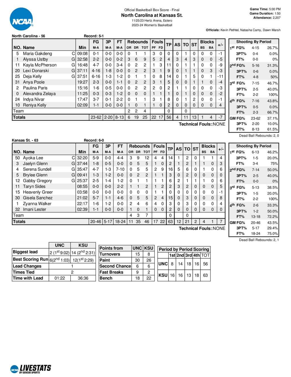 NOTES — This was the first meeting between UNC and Kansas State. … Ustby’s four points were her fewest since scoring four against South Carolina in a 69–61 NCAA tournament loss on March 25, 2022. She tied a career-low with two shots (also Nov. 8, 2020, against UNC Greensboro). … Deja Kelly’s previous high steal total in a game was four, against N.C. A&T on Nov. 9, 2021, Virginia on Jan. 20, 2022, and TCU on Nov. 12, 2022, all victories. … The 21 forced turnovers were the third time UNC has forced at least 20 this season, with 33 vs. Gardner-Webb on Nov. 8 and 24 against Hampton on Nov. 15. … Only four of UNC’s 20 field goals were assisted, another product of the bad shooting. … UNC has combined for only seven assists (three vs. Vermont) in two Gulf Coast Showcase games after averaging 15.8 in the first four games. … Carolina has made 4 of 27 3-point attempts in the tournament (14.8%) after making 28 of 93 in the first four games (30.1%). … With 13 steals against the Wildcats, UNC has at least 11 in four of six games. … Redshirt sophomore forward Teonni Key still hasn’t played this season, but recently stopped wearing a boot on her right foot. … In Saturday afternoon losers’ bracket games, Western Kentucky beat Vermont 62–50, and Purdue Fort Wayne topped Delaware 88–74. … The evening session set a Gulf Coast Showcase attendance record, men and women, with 4,257 fans.