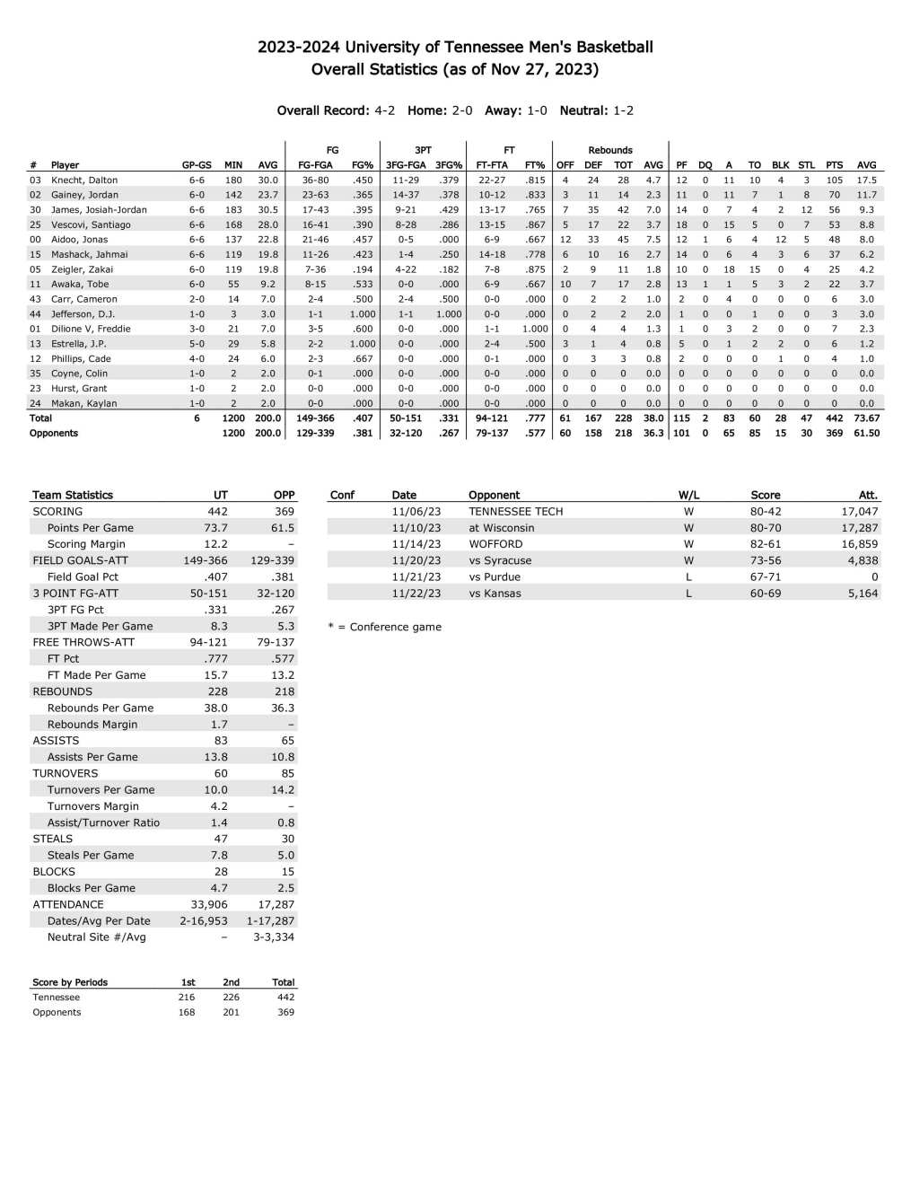 Tennessee season statistics