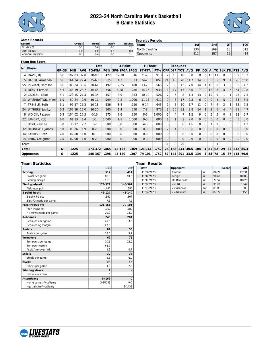 UNC season statistics