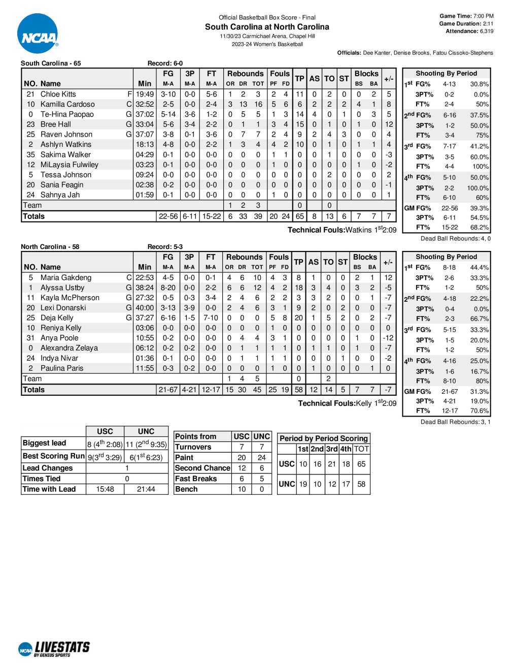 UNC (5–3) kept it close despite shooting 31.3% from the floor and 19% from 3-point range, thanks to a 45–39 rebounding edge and tough defense that forced 13 turnovers and held the Gamecocks 35.3 points below their average. After trailing for a total of 19 minutes, 11 seconds in their first five games, they trailed UNC for 21 minutes, 44 seconds Thursday.