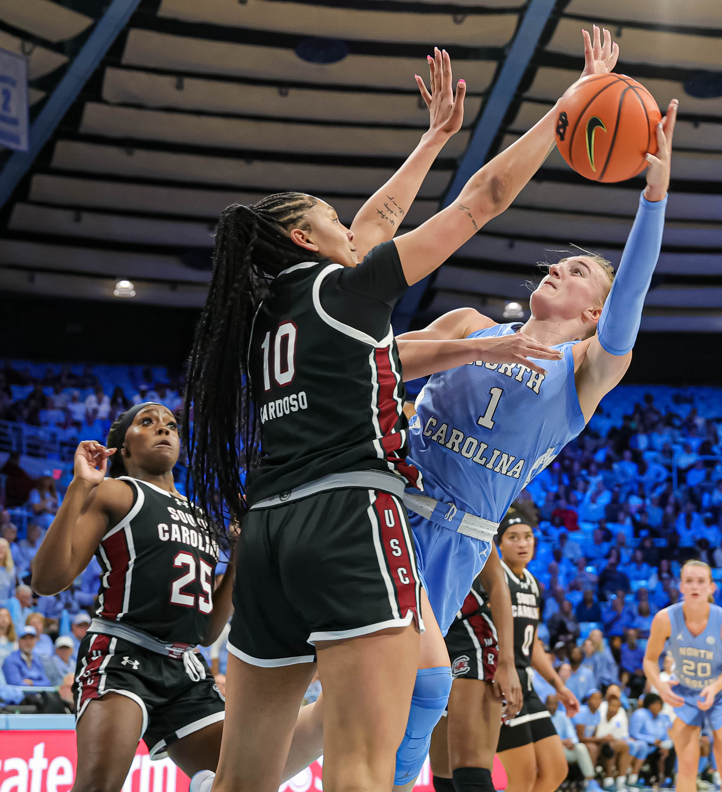 The Gamecocks, who beat UNC in the Sweet 16 by two in 2015 and eight on its way to the 2022 NCAA title, got all it could handle from the one-two offensive punch of Deja Kelly (20 points, two steals) and Alyssa Ustby (18 points, 12 rebounds, three assists, three blocks and a team-high 11.8 game score).